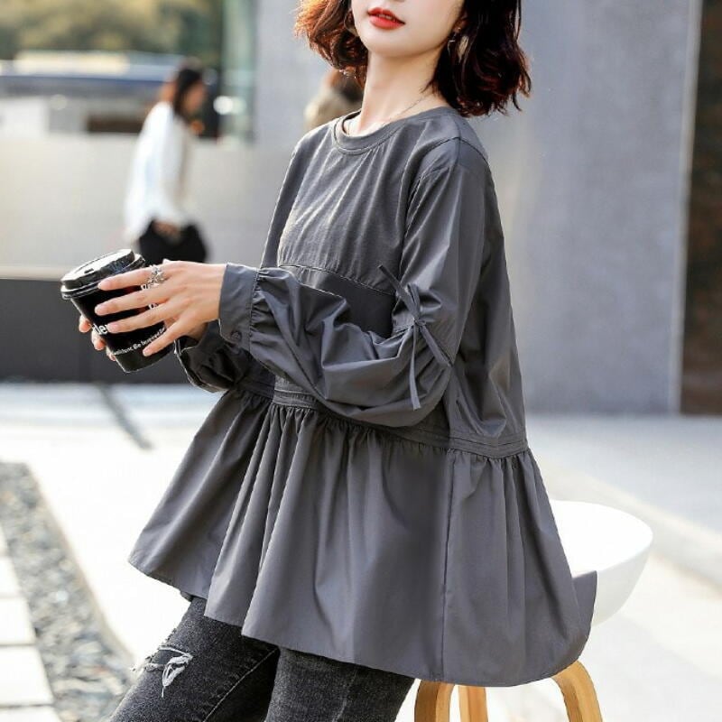 トップス カットソー 長袖 綿 コットン ブラック グレー 黒 ショート丈 春夏 オフィス リボン 韓国 レディース かわいい きれいめ 大人 スタイル 入学式 40代 体型カバー ボリューム袖 1枚で決まる 上質 uネック 薄手 大人かわいい
