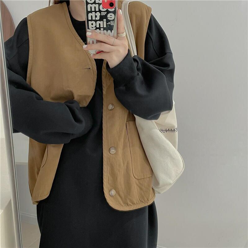 ベスト 綿 コットン ブラウン ブラック 黒 レディース 春夏 前開き おしゃれ OU-0014KM