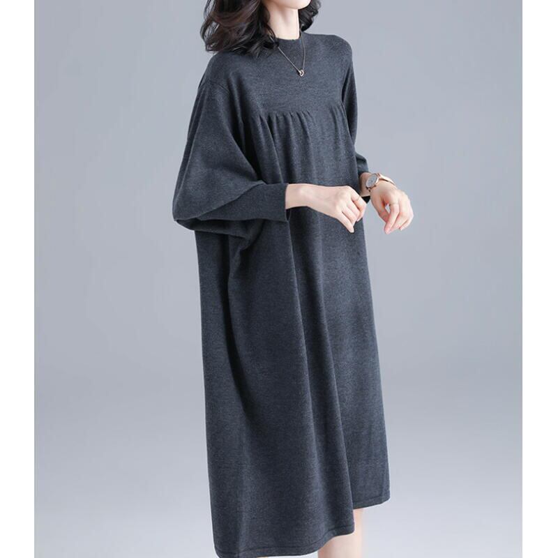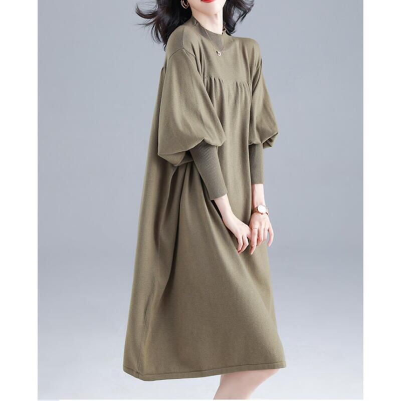 ワンピース 長袖 ロング丈 ニット ブラック グレー ブルー カーキ ベージュ 春秋冬 きれいめ レディース ロング 韓国 通勤 ゆったり ママ 20代 30代 40代 50代 60代 ナチュラル 保護者会 無地 ふわり ぽわん袖 袖あり 低身長 体型カバー 同窓会 上品 OP-0080KM