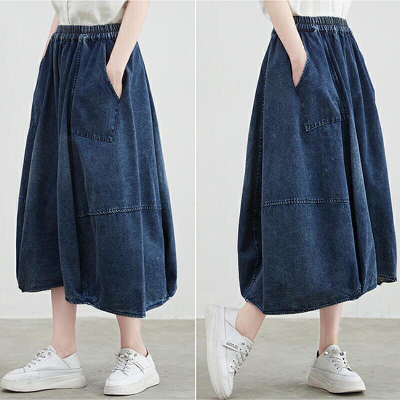スカート 綿 コットン ブルー 春夏 ロング ウエストゴム 大人 韓国ファッション 長め デニム 総ゴム ボリューム 低身長 SK-0004KM