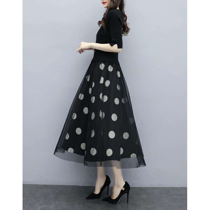 ワンピース ブラック ホワイト イエロー 黒 白 黄 春夏 aライン vネック 五分袖 長袖 水玉 韓国ファッション 総柄 フレア レース 通勤 ST-0010KM