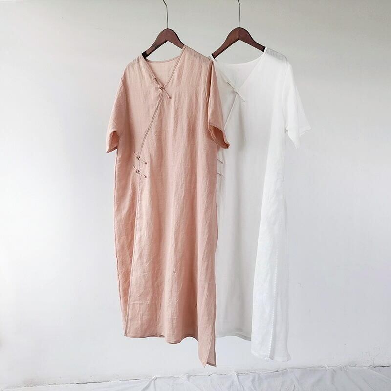 ワンピース 半袖 ロング丈 麻 リネン ホワイト ピンク 春夏 aライン きれいめ レディース ロング きれいめ オフィス カジュアル 韓国 通勤 ゆったりママ 20代 30代 40代 50代 60代 モード系 ナチュラル パーティー かわいい オフィス 上品 保護者会 ガーリー 無地 オフィスカジュアル ボタン ふわり ボリューム袖 ぽわん袖 袖あり 低身長 OP-099KM