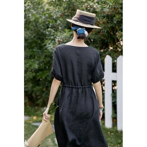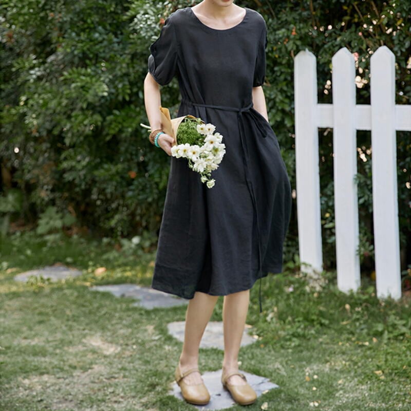 ワンピース 半袖 ミディアム丈 麻 リネン ブラック 春夏 aライン きれいめ レディース ロング きれいめ オフィス カジュアル 韓国 通勤 ゆったりママ 20代 30代 40代 50代 60代 モード系 ナチュラル パーティー かわいい オフィス 上品 保護者会 ガーリー 無地 オフィスカジュアル ボタン ふわり ボリューム袖 ぽわん袖 袖あり 低身長 OP-100KM