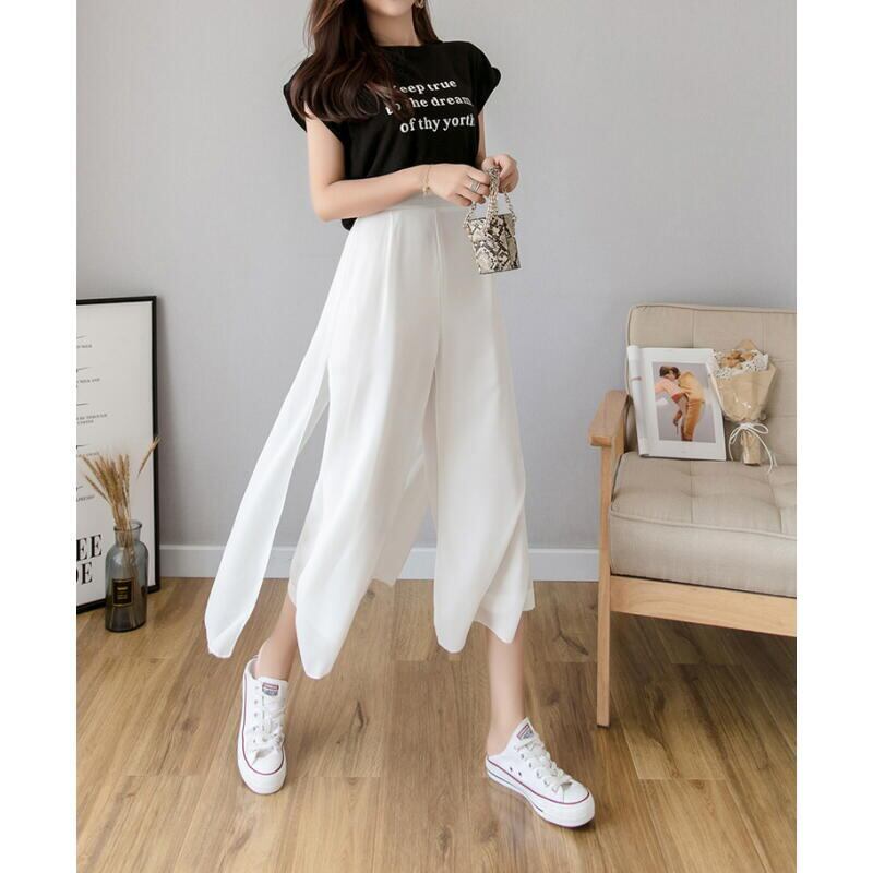 パンツ ブラック ホワイト ライトブルー 春夏 変形 七分丈 ゆったり レディース ウエスト ゴム ワイド 50代40代 カラー きれいめ スリット BM-005KM