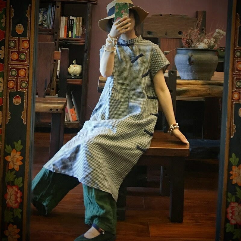 ワンピース 半袖 ミディアム丈 麻 リネン グリーン系 春夏 きれいめ レディース きれいめ カジュアル 韓国 ゆったりママ 20代 30代 40代 50代 60代 ナチュラル パーティー かわいい 保護者会 ガーリー 格子柄 チャイナ 袖あり 低身長 OP-107KM