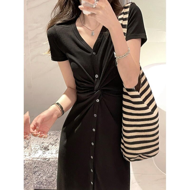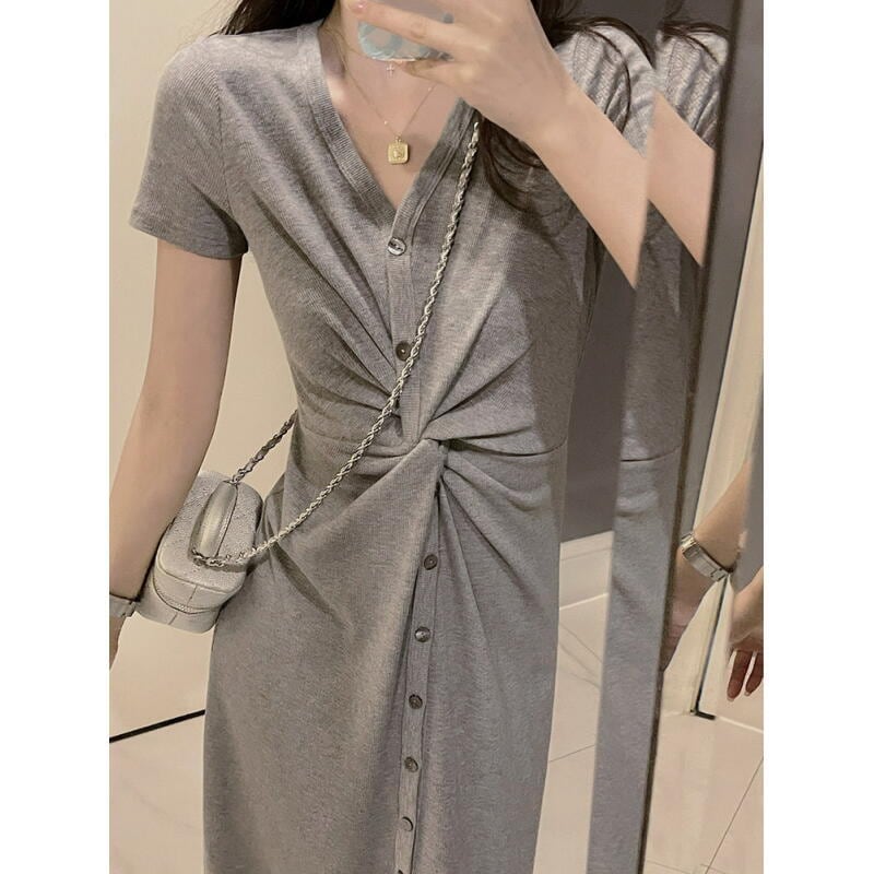 ワンピース 半袖 ロング丈 ブラック グレー 春夏 aライン vネック きれいめ レディース カジュアル 韓国 通勤 ゆったりママ 20代 30代 40代 50代 60代 ナチュラル かわいい 上品 保護者会 ガーリー 無地 オフィスカジュアル ふわり 袖あり ボタン 低身長 OP-161KM
