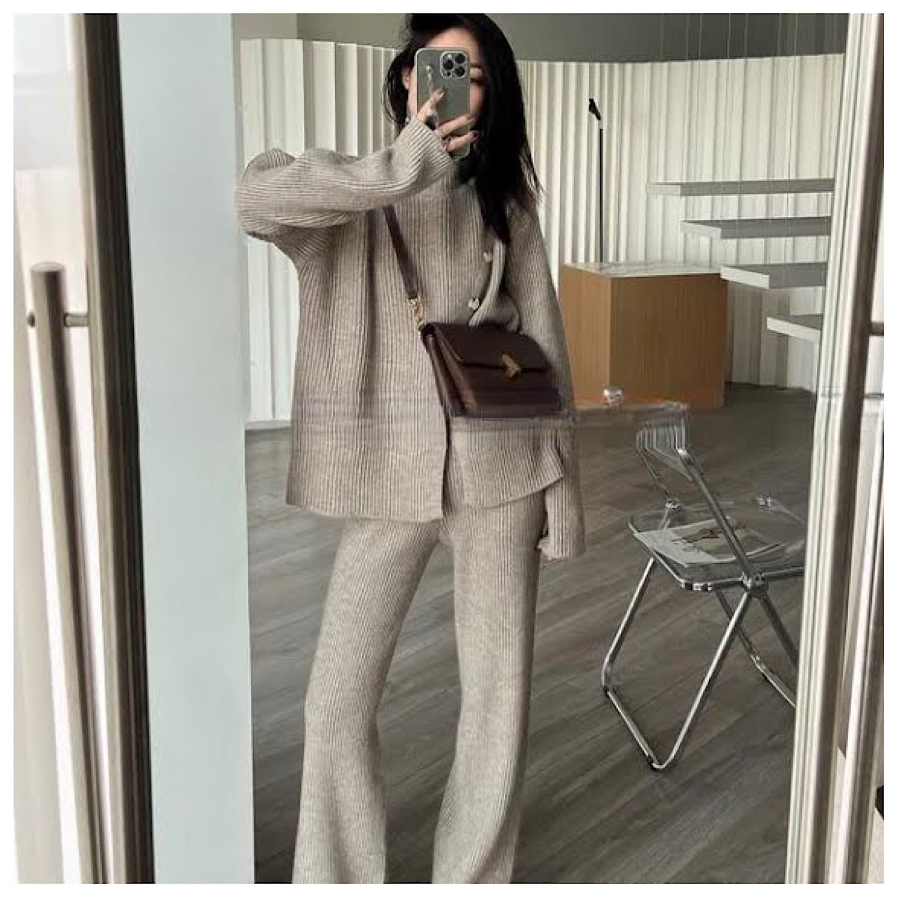 ハイカラー ニット セーター パンツ ツー ピース セット 新作 韓国 カジュアル セットアップ レディース ニットスーツ 秋冬 プルオーバー ワイドパンツ スーツ ゆったり 上下セット 着痩せ おしゃれ きれいめ 大人 着回し 体型カバー 通勤 オフィス 入学式 卒業式 30代 40代 50代 ST-053KMY