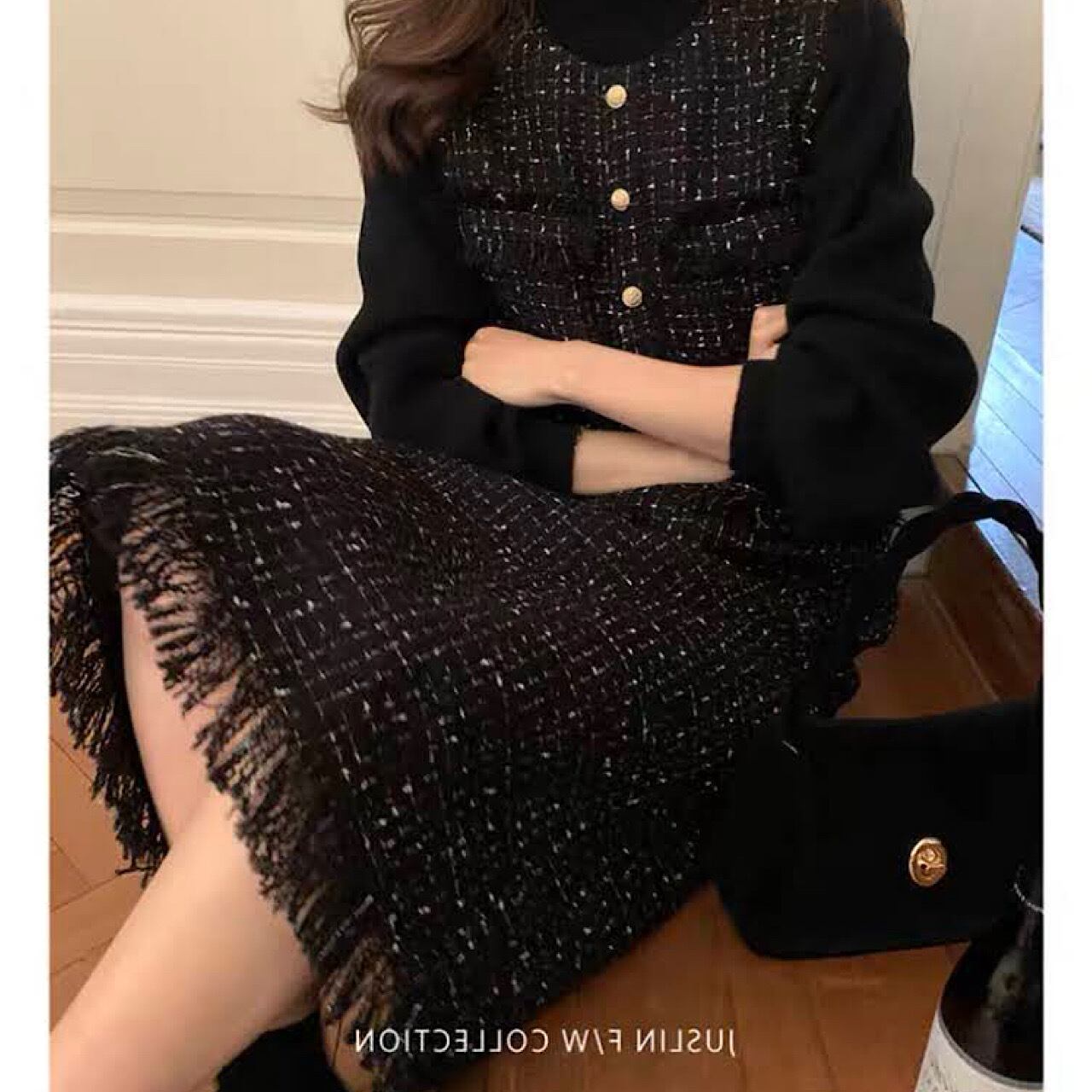 秋冬 新作 軽い 高級感 ブラック ウール サスペンダー ドレス フレンチ セーター 2点セット 韓国 ジャンパースカート コーデ 秋 冬 大人 大きいサイズ vネック レディース 黒 スカート フレア ロングワンピース オールインワン 低身長 ツイード きれいめ エレガント かわいい カジュアル ロング丈 マキシ丈 30代 40代 50代 OP-031KMY
