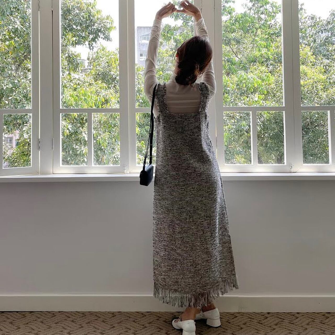 ツイード サスペンダー スカート スーツ 韓国 ジャンパースカート コーデ 秋 冬 大人 大きいサイズ vネック レディース 黒 スカート フレア ロングワンピース オールインワン 低身長 きれいめ エレガント かわいい カジュアル ロング丈 マキシ丈 30代 40代 50代 OP-035KMY