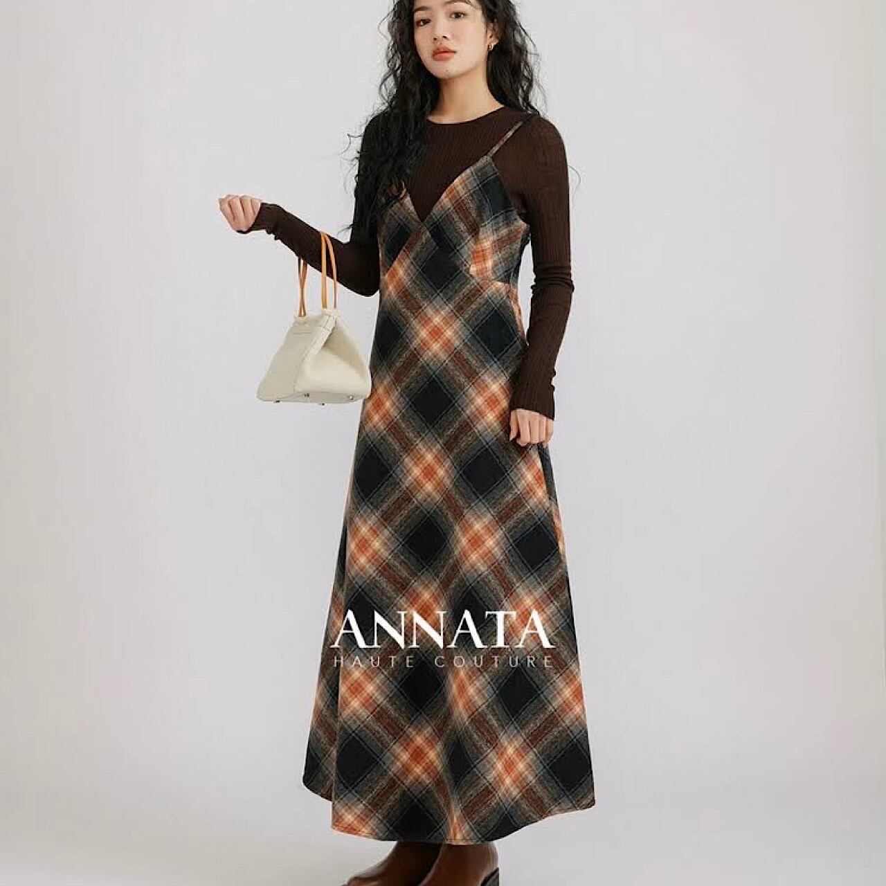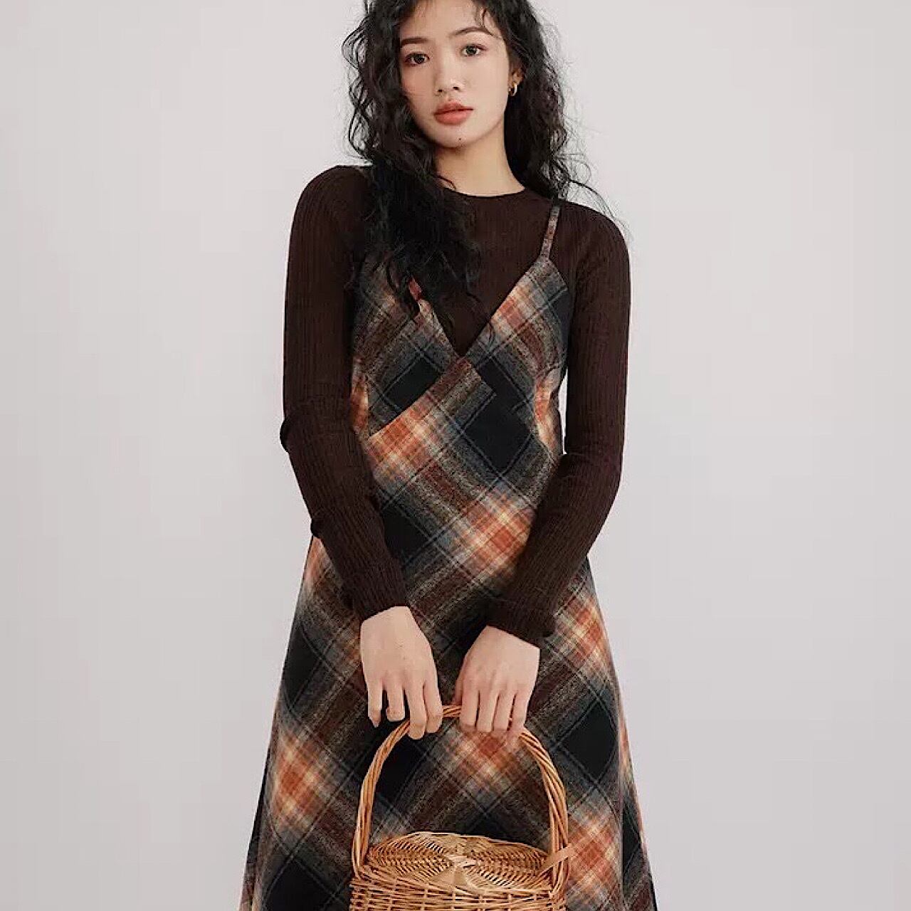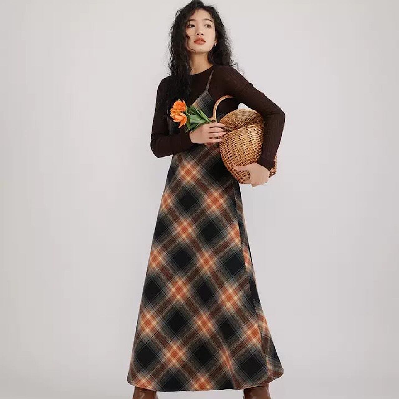 チェック 柄 ウール ドレス インナー 韓国 ジャンパースカート コーデ 秋 冬 大人 大きいサイズ vネック レディース 黒 スカート フレア ロングワンピース オールインワン 低身長 ツイード きれいめ エレガント かわいい カジュアル ロング丈 マキシ丈 30代 40代 50代 OP-063KMY