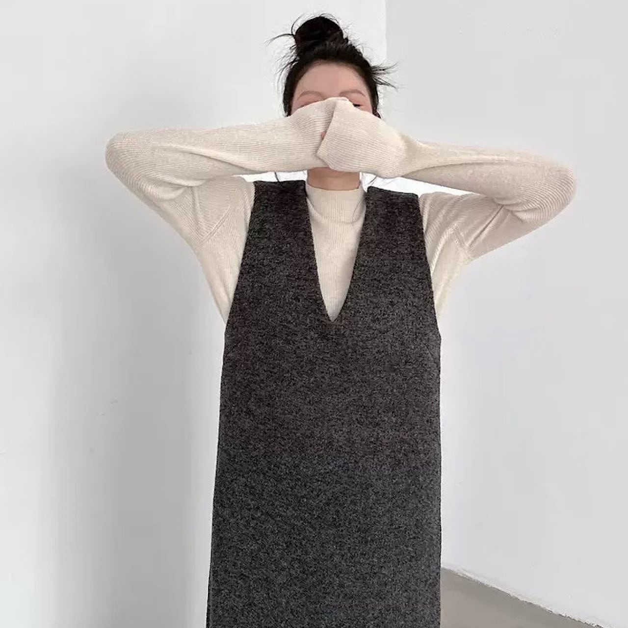 オール ウール V ネック ストレート ウォーム ドレス 韓国 ジャンパースカート コーデ 秋 冬 大人 大きいサイズ vネック レディース 黒 スカート フレア ロングワンピース オールインワン 低身長 ツイード きれいめ エレガント かわいい カジュアル ロング丈 マキシ丈 30代 40代 50代 OP-077KMY