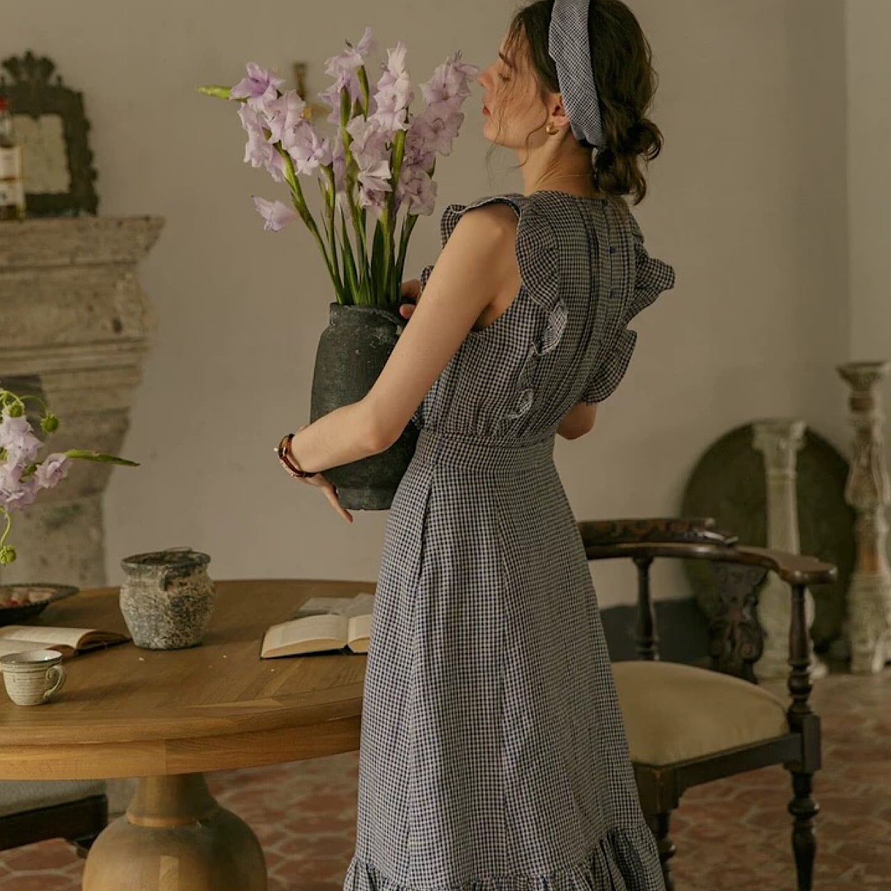 レトロ チェック 柄 ドレス レディース ノースリーブ ウエスト スリム ミディアム リネンワンピース きれいめ 大人 おすすめ かわいい エレガント フルリネン ロング カジュアル 大きいサイズ 麻 上品 ゆったり シンプル 着回し 30代 40代 50代 OP-146KMY