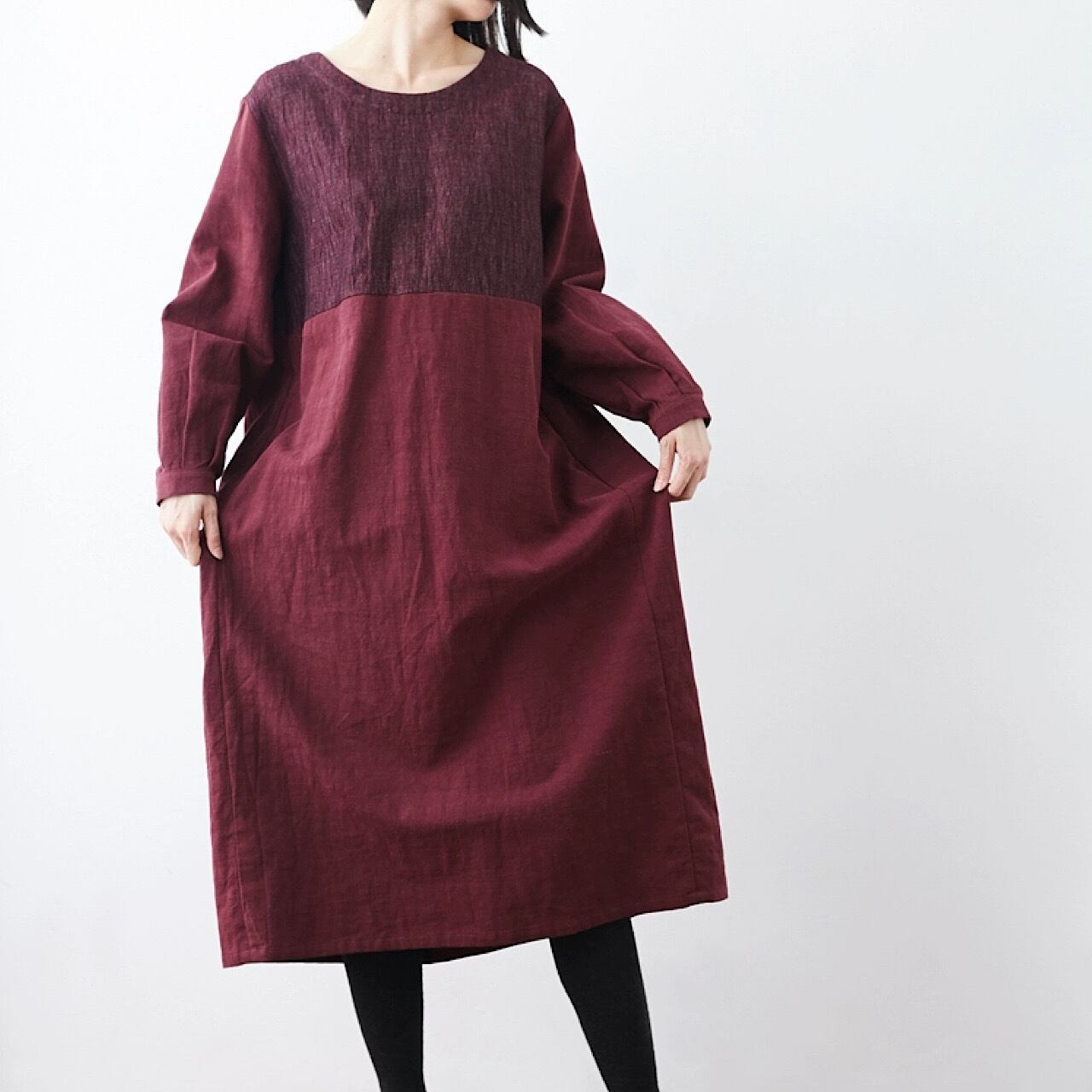 リネンステッチ レトロ ハイウエスト長袖リネンワンピース きれいめ 大人 おすすめ かわいい エレガント フルリネン ロング カジュアル レディース 大きいサイズ 麻 上品 ゆったり シンプル 着回し 30代 40代 50代 OP-166KMY