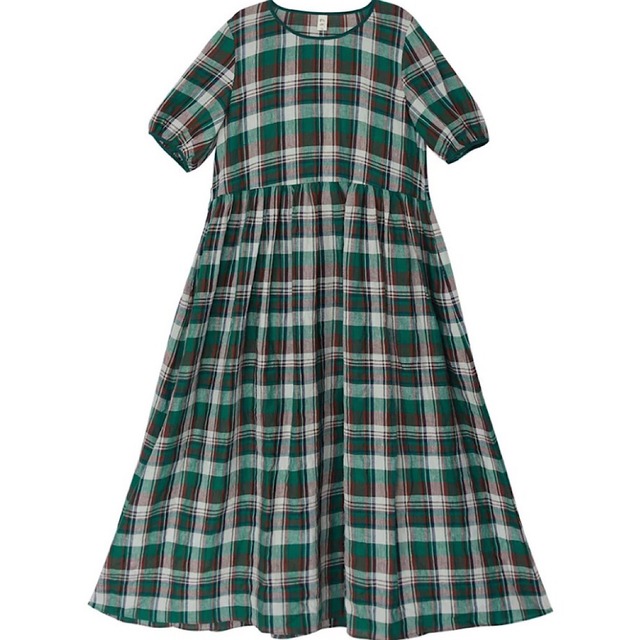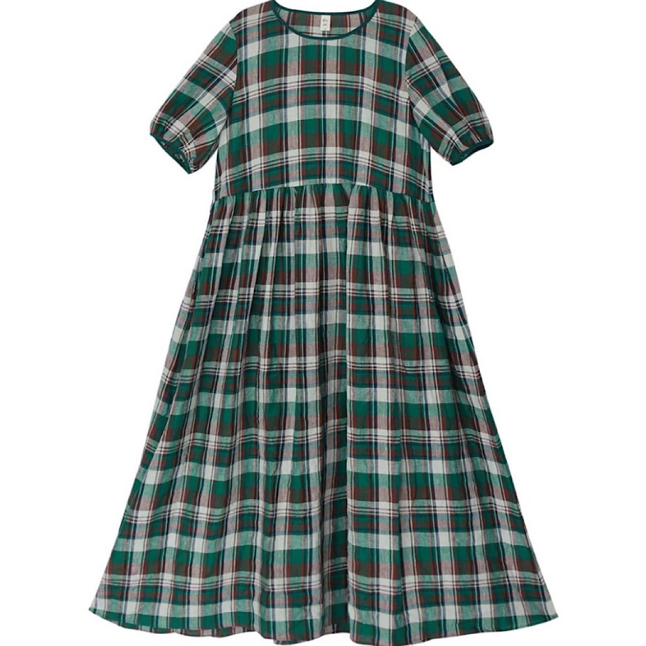 リネン半袖ドレス ハイウエスト 格子 緑 ロングスカート ラウンド ネックス リネンワンピース きれいめ 大人 おすすめ かわいい エレガント フルリネン ロング カジュアル レディース 大きいサイズ 麻 上品 ゆったり シンプル 着回し 30代 40代 50代 OP-172KMY
