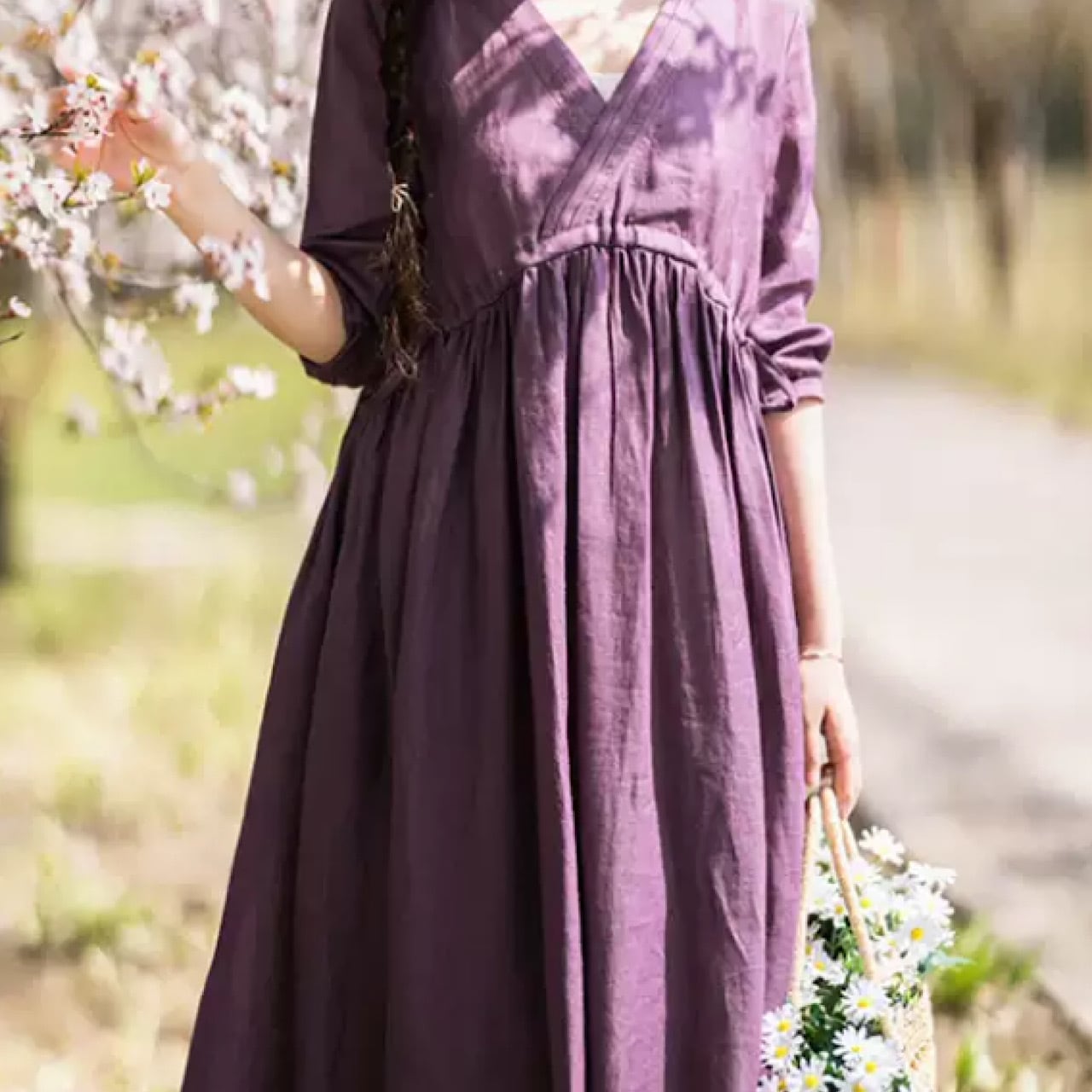 Vネック つなぎ ロング スカート 紫 リネンワンピース きれいめ 大人 おすすめ かわいい エレガント フルリネン ロング カジュアル レディース 大きいサイズ 麻 上品 ゆったり シンプル 着回し 30代 40代 50代 OP-173KMY