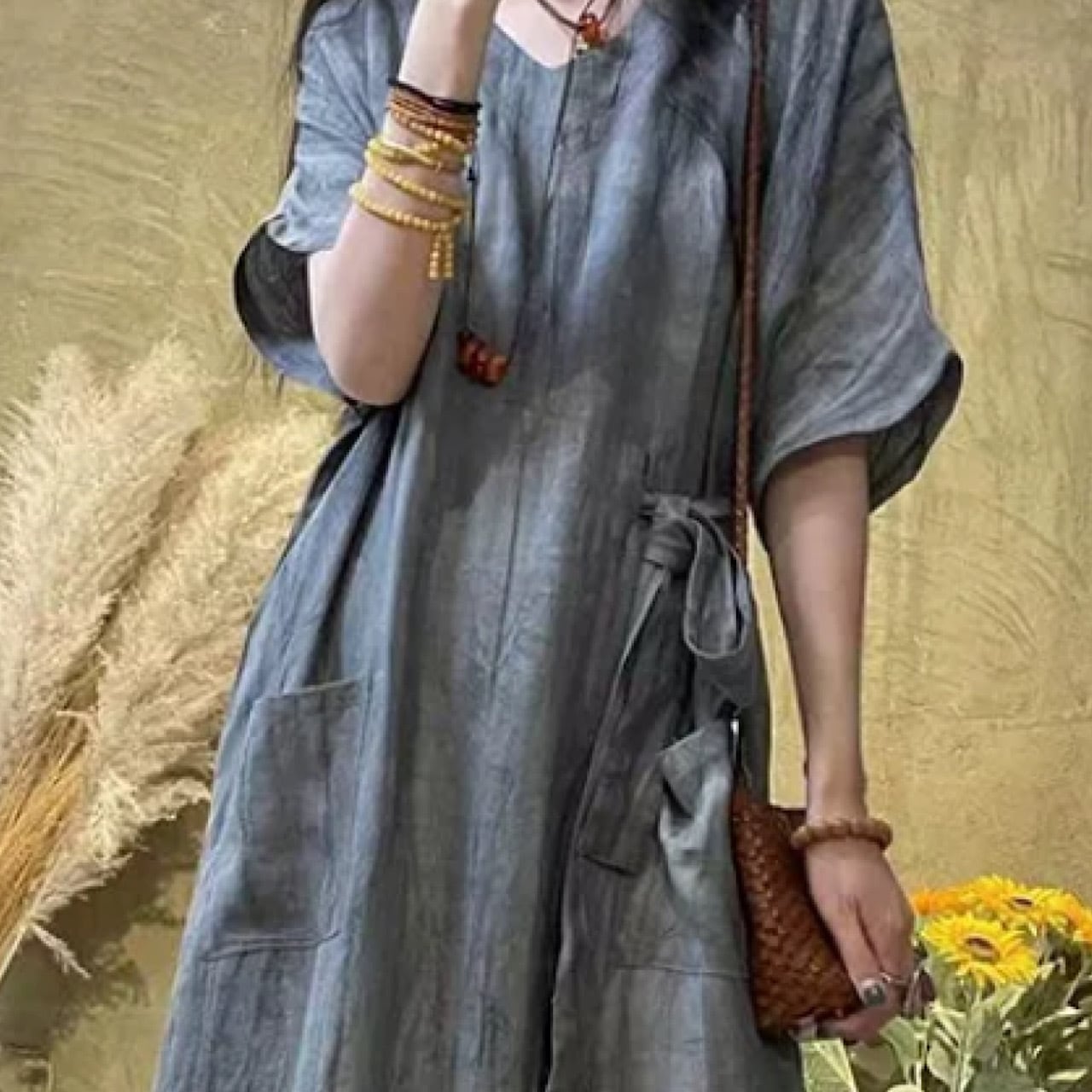 薄いリネンV ネック ハイウエストドレス リネンワンピース 半袖 きれいめ 大人 おすすめ かわいい エレガント フルリネン ロング カジュアル レディース 大きいサイズ 麻 上品 ゆったり シンプル 着回し 30代 40代 50代 OP-180KMY