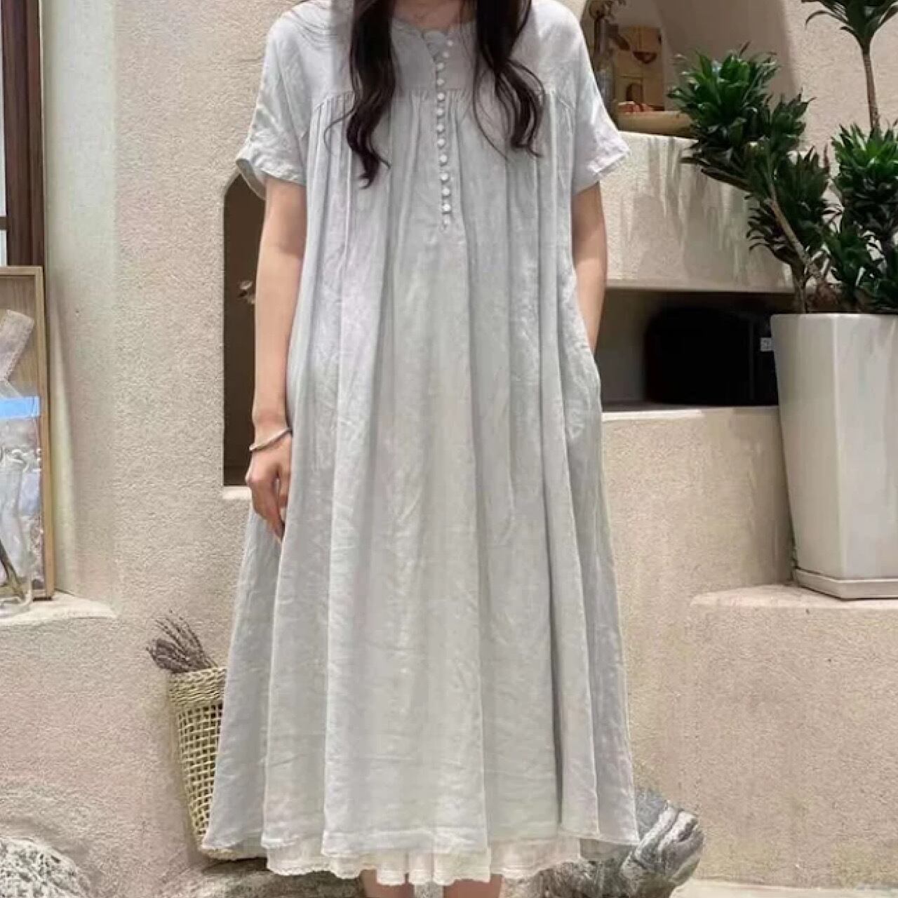 マルチ ボタン プルオーバー ラウンド ネック ルーズ ウエスト 無地 スカート 半袖 ワンピリネンワンピース きれいめ 大人 おすすめ かわいい エレガント フルリネン ロング カジュアル レディース 大きいサイズ 麻 上品 ゆったり シンプル 着回し 30代 40代 50代 OP-182KMY