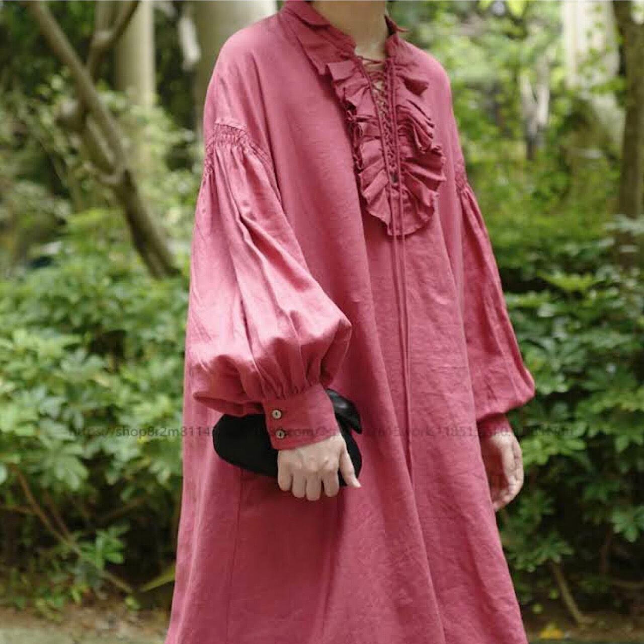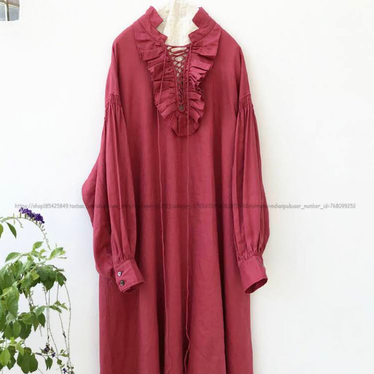 トレンド ネック フリル リネンランタンスリーブ ドレス リネンワンピース きれいめ 大人 おすすめ かわいい エレガント フルリネン ロング カジュアル レディース 大きいサイズ 麻 上品 ゆったり シンプル 着回し 30代 40代 50代 OP-190KMY