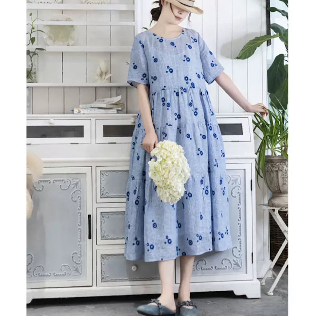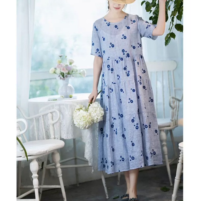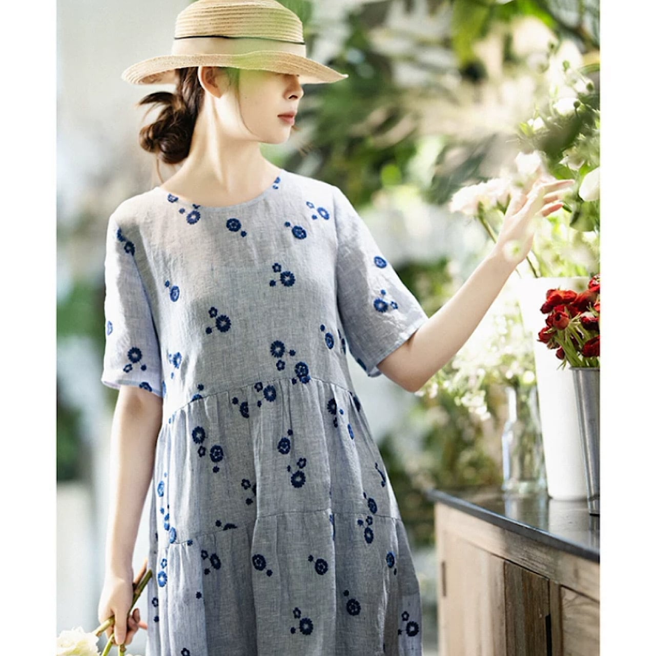 刺繍 半袖 ラウンド ネック プルオーバー ルーズ ブルードレス ピュアリネンワンピース きれいめ 大人 おすすめ ロング カジュアル レディース 大きいサイズ 麻 上品 ゆったり シンプル 着回し 30代 40代 50代 OP-219KMY