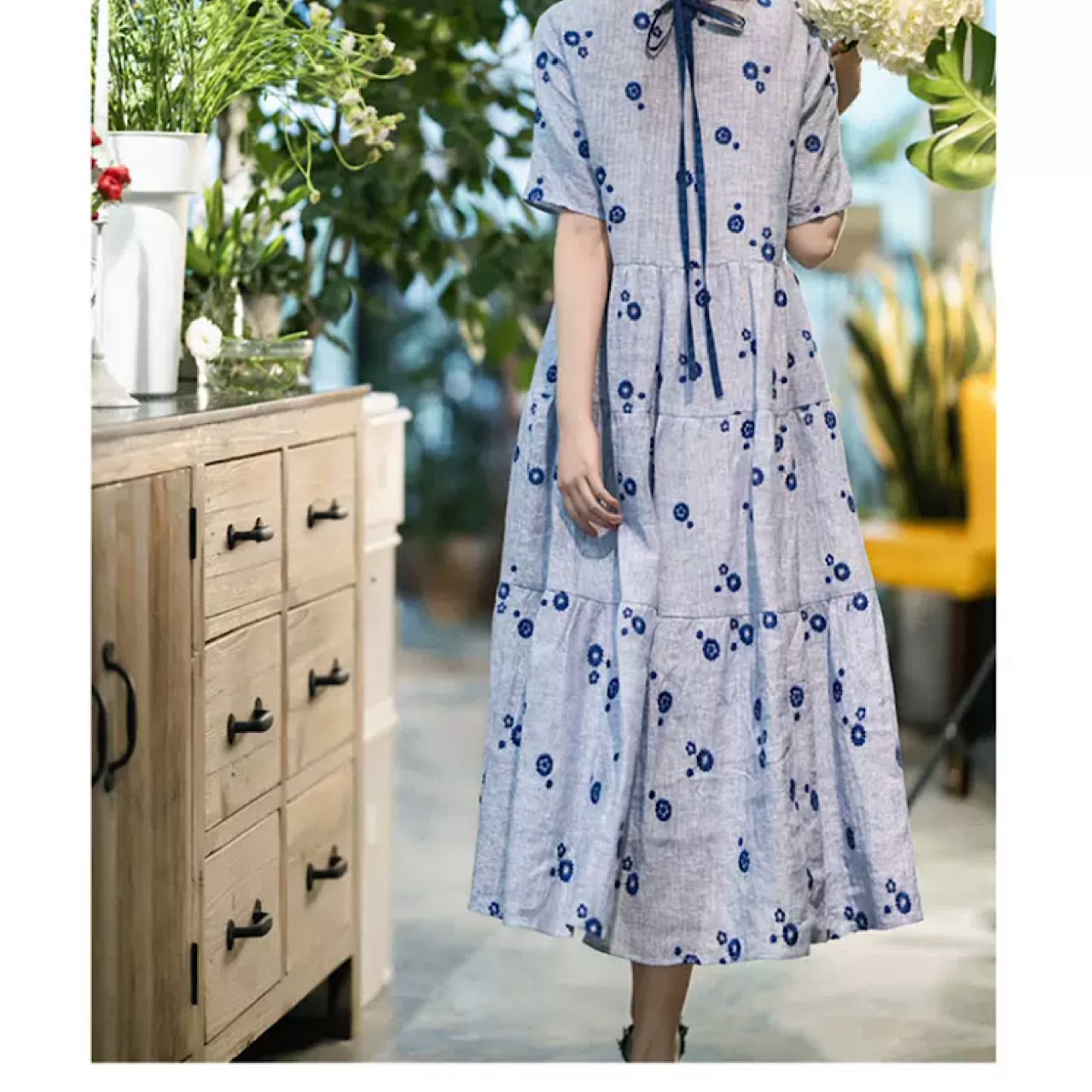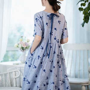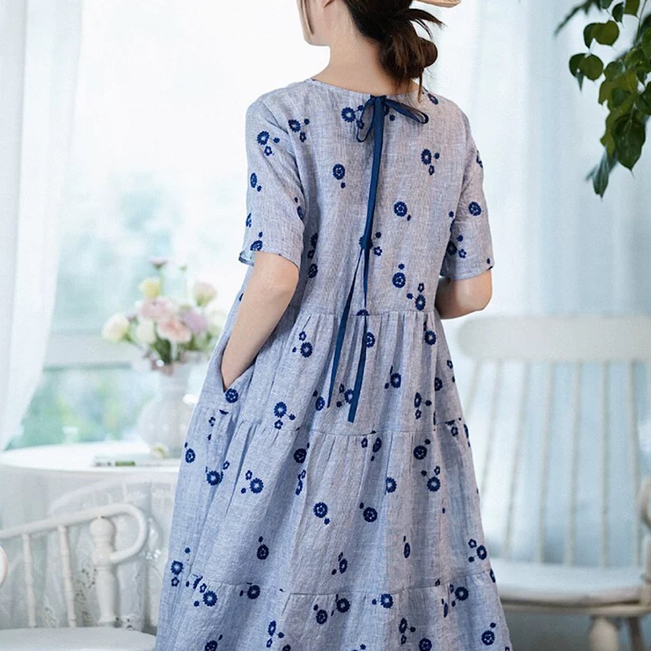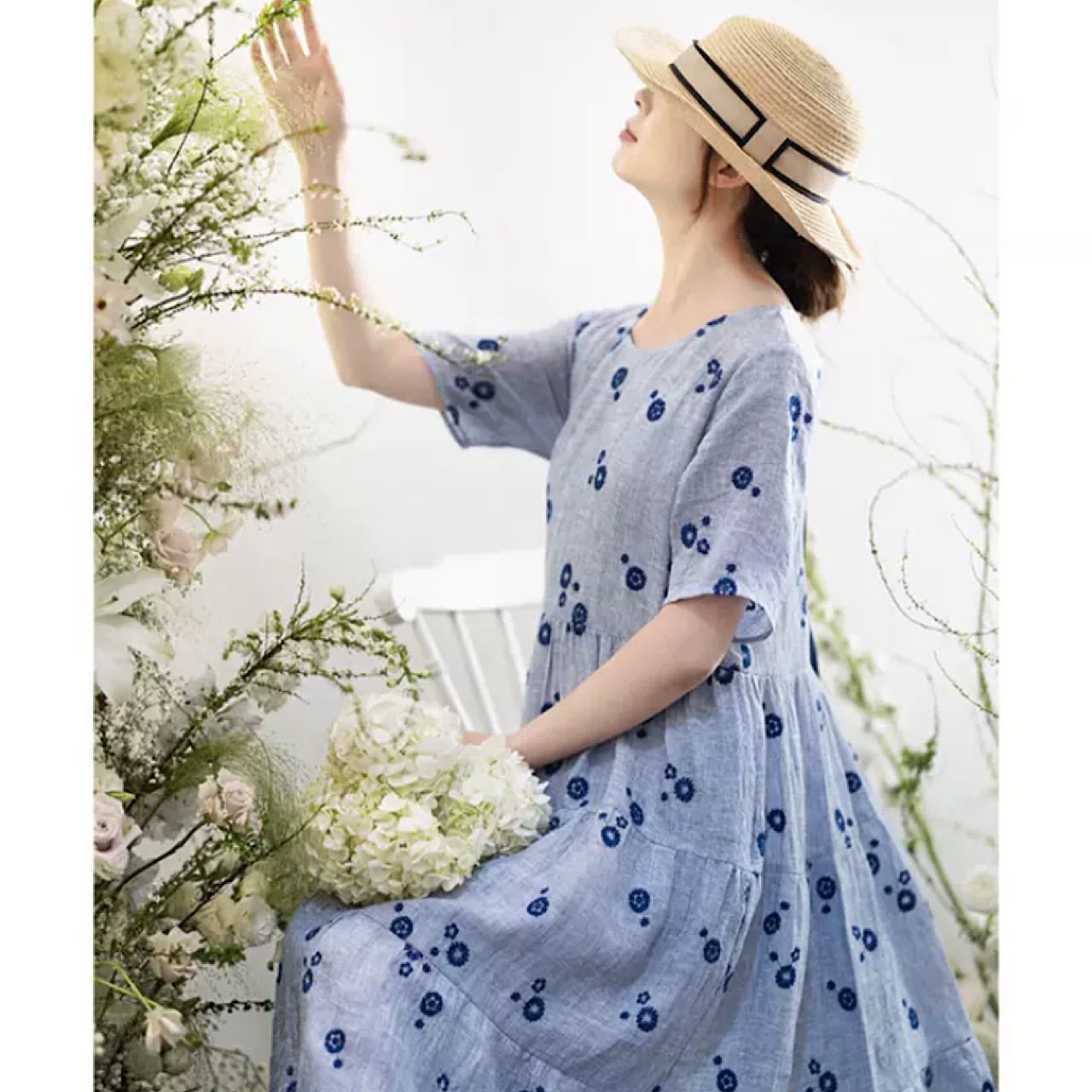 刺繍 半袖 ラウンド ネック プルオーバー ルーズ ブルードレス ピュアリネンワンピース きれいめ 大人 おすすめ ロング カジュアル レディース 大きいサイズ 麻 上品 ゆったり シンプル 着回し 30代 40代 50代 OP-219KMY