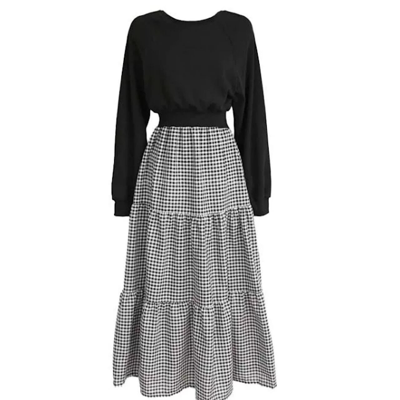 プリーツ チェック 柄 ドレス ツーピース セーター ハイウエスト ワンピース ドレス 長袖 きれいめ aライン ロング 大きいサイズ かわいい 黒 春冬 シンプル レディース 韓国 カジュアル 大人 レトロ 30代 40代 50代 OP-254KMY