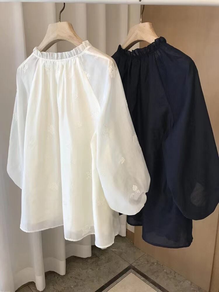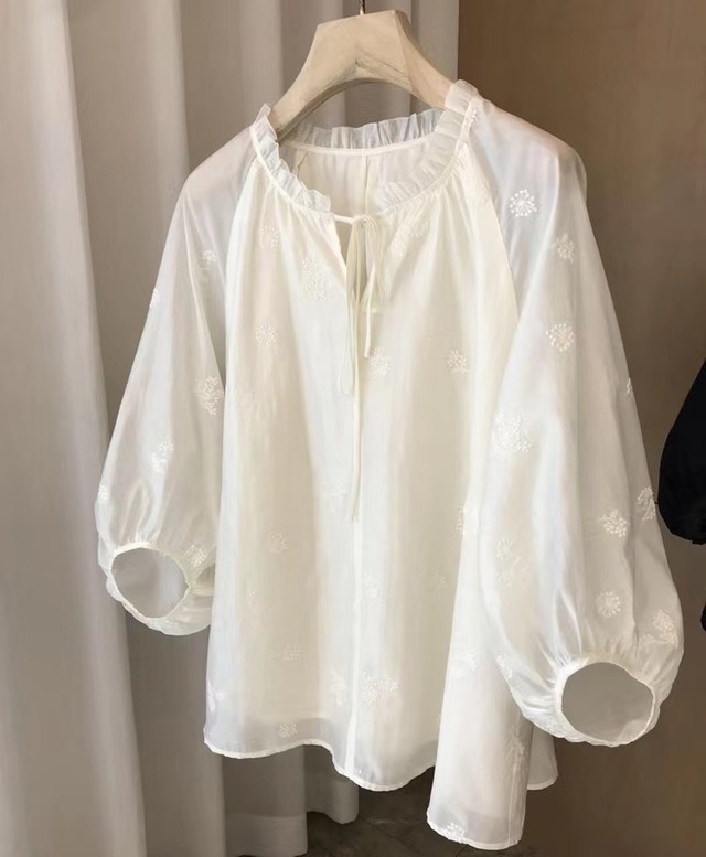 新作 フレンチレトロバルーンスリーブブラウス 刺繍 シャツ シアー リボン 九分袖 ぽわん袖 ゆったり レトロ 軽やか 春夏秋 デート お出かけ お呼ばれ 二次会 レディース トップス 体型カバー 大人可愛い かわいい フェミニン きれいめ エレガント 20代 30代 40代 50代