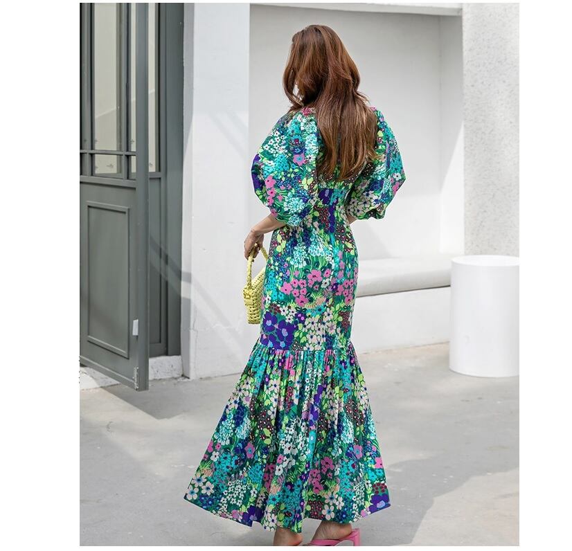 ボタニカルフラワーワンピース 花柄 フラワー フローラルドレス ロング パフスリーブ ボリューム袖 フェミニン マーメイド 大人可愛い エレガント お出かけ デート レディース ビーチ リゾート 華やか 春 夏 秋 20代 30代 40代