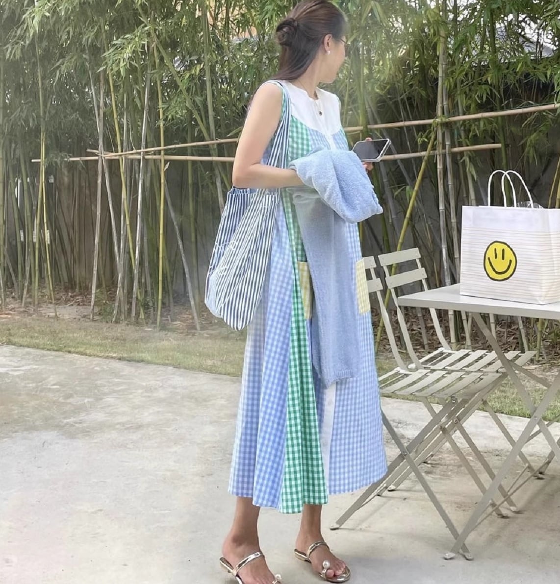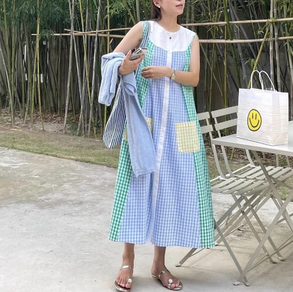 パッチワークワンピース サマーワンピ ギンガムチェック マルチカラー カラフル パッチワーク 柄 ロング ノースリーブ コントラスト レトロ きれいめ 大人可愛い デート 普段着 リラックス ママ トレンド 春 夏 秋 レディース カジュアル シンプル 10代 20代 30代 40代