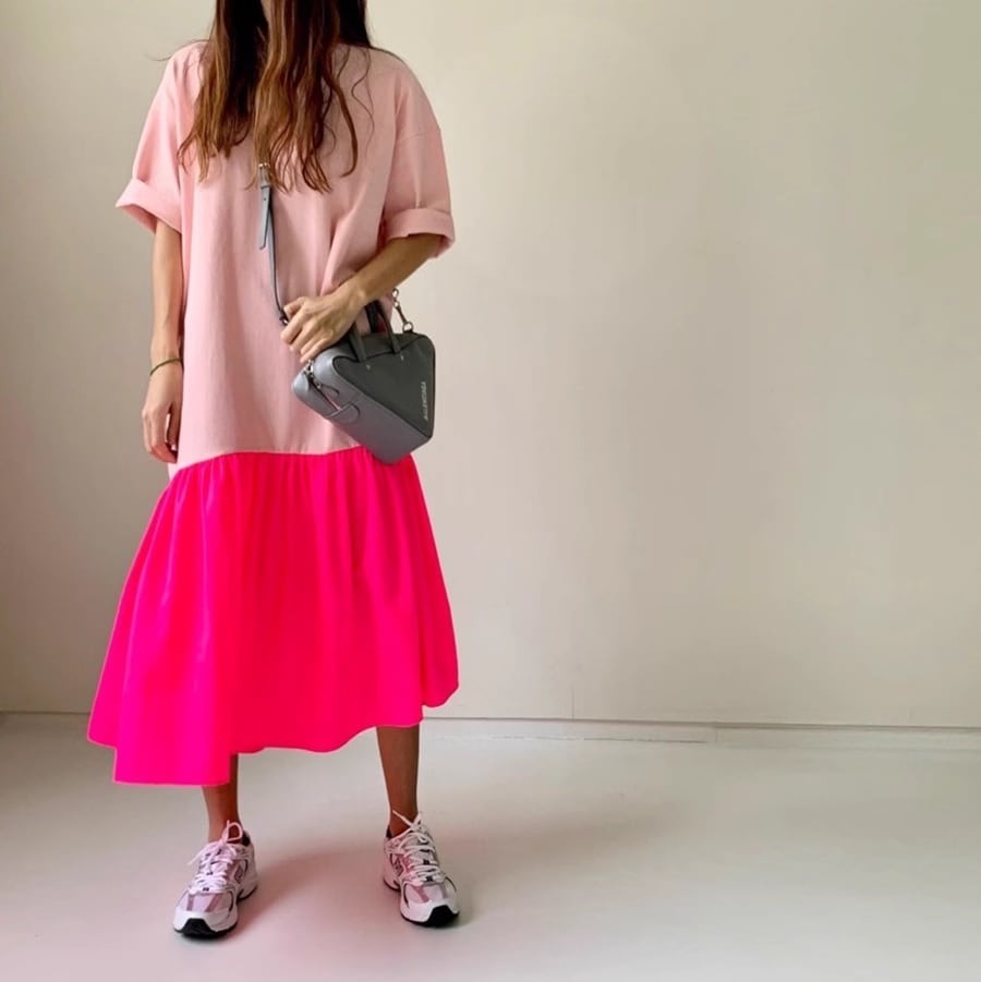 バイカラーが新鮮なムード。スニーカーに合わせると素敵!