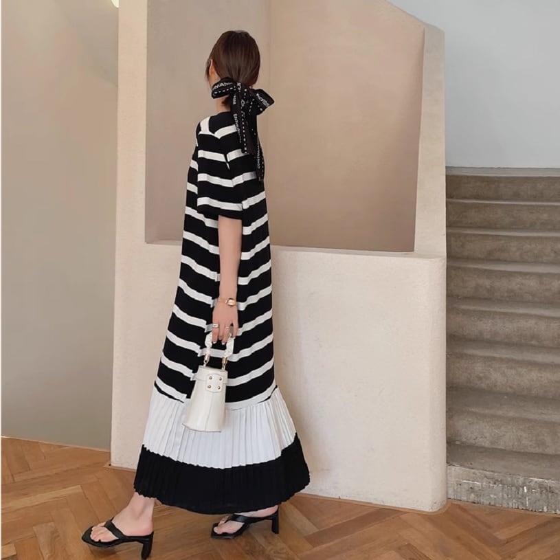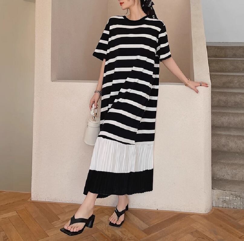 バイカラーワンピース ボーダー プリーツ ロング ワンピ コントラスト ブロックカラー ロング 半袖 マキシ オシャレ きれいめ ナチュラル ゆったり ルーズ 大人 リラックス 海 トレンド 春 夏 レディース カジュアル シンプル リゾート 旅行 ぽっちゃり 大きいサイズ