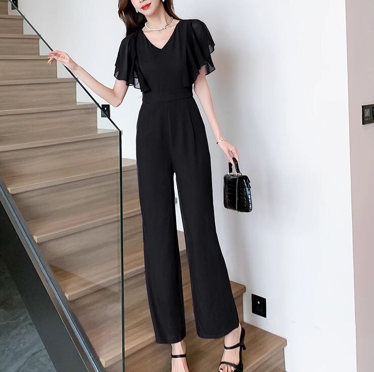 フリル オールインワン ジャンプスーツ Vネック サロペット ワイド パンツ 着回し ワントーン 薄手 軽やか 春 夏 秋 大きいサイズ サイズ 豊富 フレンチスリーブ シック エレガント きれいめ 上品 お呼ばれ お出かけ デート 結婚式 OW-1202CMY