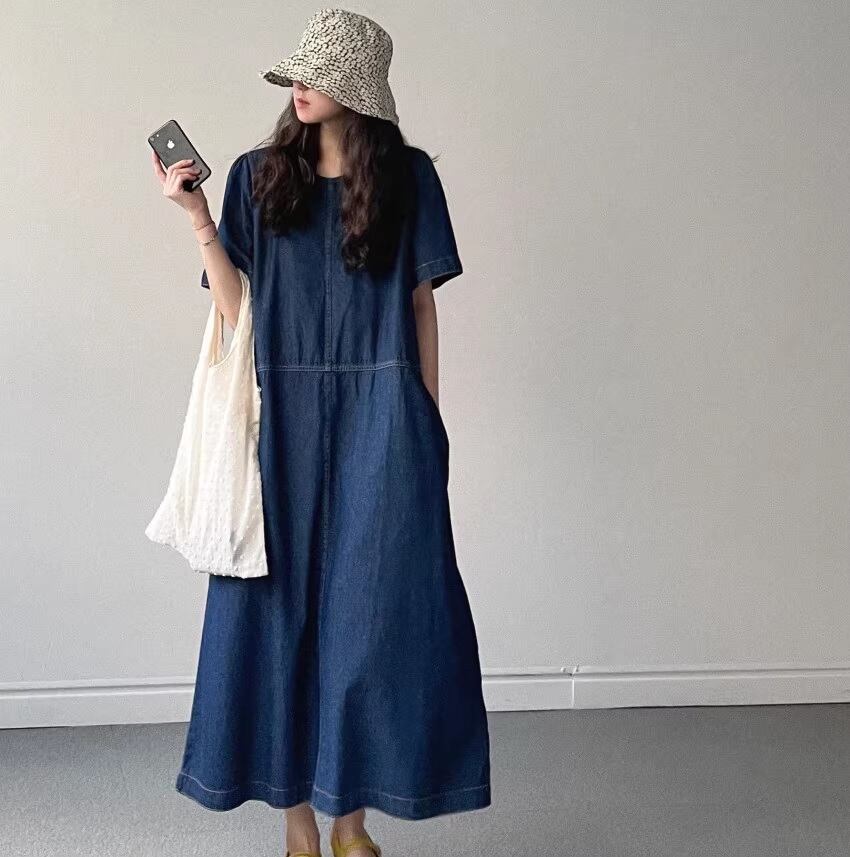 デニムワンピース ワンピ ワンピース デニム ロング 長め 体型カバー 着回し ワントーン 春 夏 秋 半袖 ステッチ 無地 旅行 ブルー 水色 ライトブルー ゆったり カジュアル シンプル 大人 レディース 10代 20代 30代 40代 50代 レディース OP-1209CMY
