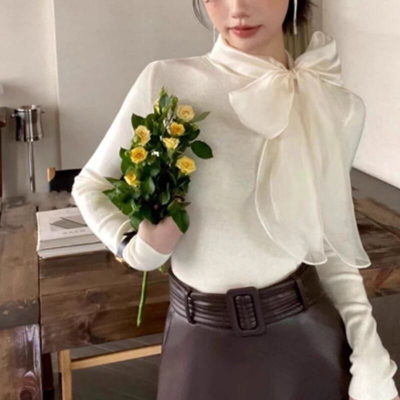 ビッグリボン トップス タイトトップス BIG トップス ロングスリーブ 長袖 可愛い クラシカル エレガント きれいめ 着回し 人気 レディース 可愛い ガーリー 新作 女性 韓国 人気 デート お出かけ 春 秋 冬 20代 30代 40代 ベージュ ブラック パープル
